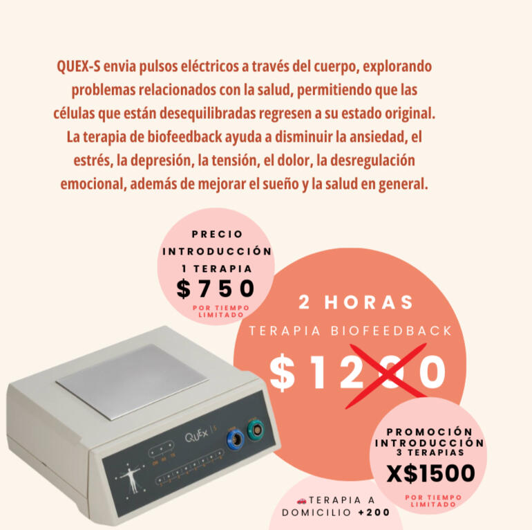Una terapia no invasiva que ayuda a reducir el estrés, regular las emociones y nos hace conscientes sobre el estado de nuestro organismo en tiempo real, como lo es el ritmo cardiaco, la respiración y la actividad cerebral.QUEX S es un dispositivo terapéutico de tecnología Biofeedback, un sistema de gestión del estrés que mide reacciones electrofisiológicas y campos de biorresonancia mediante el envio de frecuencias electromagnéticas y equilibrio energético, activando la capacidad de autocuración del cuerpo.Esta terapia puede utilizarse para abordar una variedad de problemas de salud, incluidos el estrés, la ansiedad, el dolor crónico, TDAH, la depresión y otros trastornos fisiológicos y emocionales.